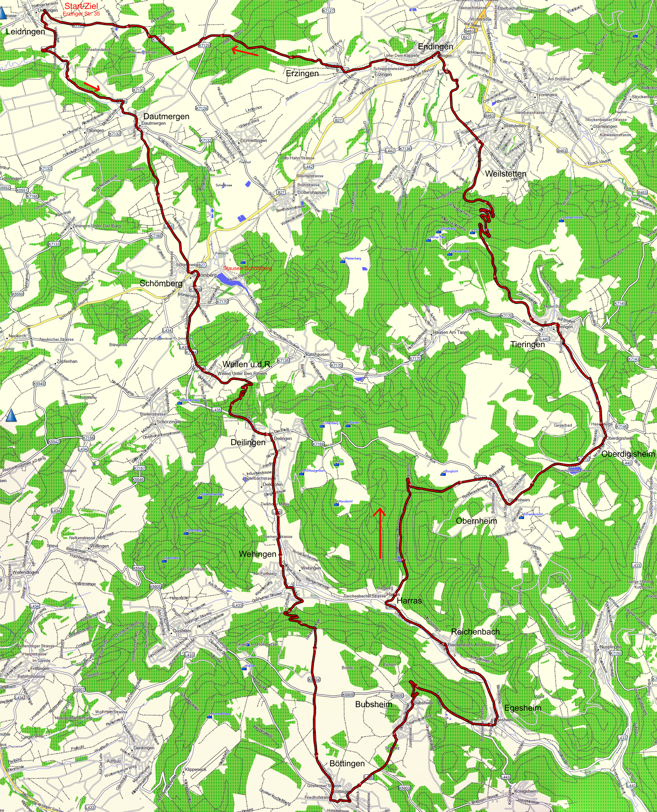 Wegen der Länge der Töur macht eine Wegbeschreibung wenig Sinn - am besten mit dem Handy oder Radcomputer die GPX-Datei herunterladen und die Strecke nachfahren. Da viel auf Auto-Nebenstraßen oder Radwegen entlang von Autostraßen gefahren wird, können Sie die Runde auch einfach entsprechend den 17 durchfahrenen Orten nachfahren. Eine wirklich sehr schöne Runde - insbesondere für Rennradfahrer. Die Strecke ist: Leidringen - Dautmergen - Schömberg - Weilen u.d.R. - Deilingen - Wehingen - Böttingen - Bubsheim - Egesheim - Reichenbach - Harras - Obernheim - Oberdigisheim - Tieringen - Lochenpaß - Weilstetten - Endingen - Erzingen - Leidringen. |