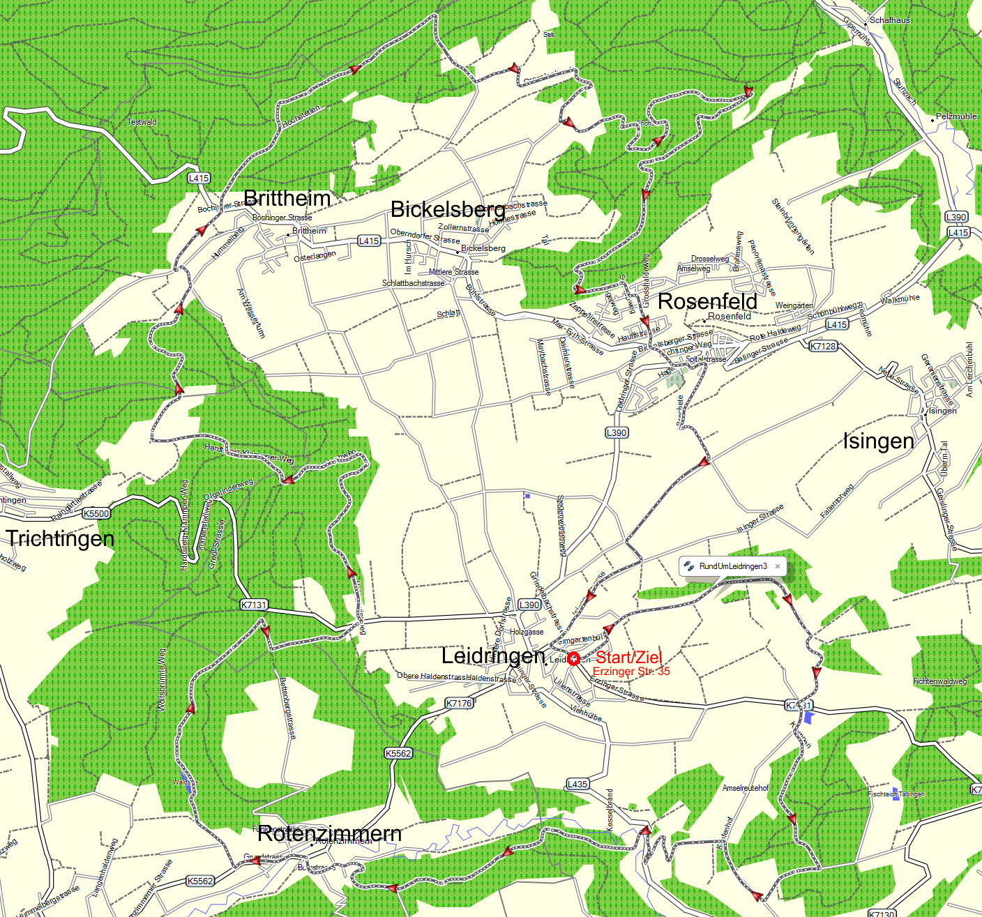 Oben dann rechts auf den Ortsverbindungsweg abbiegen. Da die Strecke oft durch den Wald mit unzähligen Abbiegungen geht, ist es unerlässlich diese Strecke per Handy, oder Radcomputer nachzufahren. Eine GPX-Datei ist downloadbar. Das meiste auf der Strecke sind Schotterwege - mal fein aber auch mal grob. Die Strecke führt zunächst über den Buchberg bis zum Sportheim Leidringen. Vor dem Sportheim links und dann steil einen Waldweg hoch und auf geteertem Ortsverbindungsweg runter zur Michelesmühle. Dann über den Buchwald und die Käpfle-Halle nach Rotenzimmern. Über den Waldsee wieder hoch in Richtung Trichtinger-Straße. Nun eine Weile eben und danach steil bergab (Vorsicht!) bis kurz vor Trichtingen. Dann wieder hoch in Richtung Brittheim. Brittheim lassen wir rechts liegen und fahren durch den Wald in Richtung Häsel (Bickelsberg). Über Feld- und Forstwege geht es hoch bis kurz vor Bickelsberg und dann einen etwas "groben" Wald - und Wiesenweg wieder in den Wald auf einen besser befestigten Forstweg zurück. Hier geht es zunächst wieder recht eben, dann bergab, wieder eben und dann ein kurzes Stück sehr steil bergauf nach Rosenfeld. In Rosenfeld an der Schule vorbei runter ans Freibad (Sofienbad). Hier kann man sich nach der anstrengenden Fahrt erholen (wenn Sie nur zum Kiosk gehen, brauchen Sie keinen Eintritt zu zahlen). Danach geht es hoch, am Rosenfelder Sportgelände vorbei und über den Ortsverbindungsweg zurück nach Leidringen. |