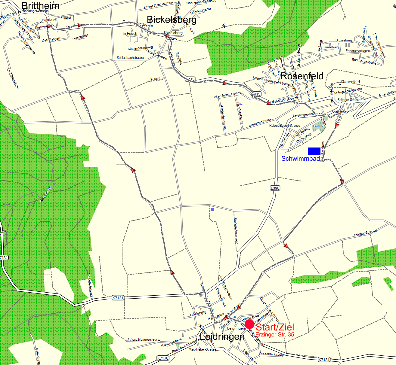 Rosenfeld bis Ortsausgang. Nun fahren Sie links in Richtung Trichtingen und biegen dann nach ca. 150m rechts ab nach Brittheim (ca. 3km). Dann bei der Kirche-Brittheim rechts abbiegen und am Ortsende auf dem Radweg (links von der Hauptstraße) nach Bickelsberg und dann nach Rosenfeld fahren. In Rosenfeld an der Schule vorbei und dann rechts hinunter zum Schwimmbad (Sofienbad). Hier können Sie sich bei Bedarf etwas erholen oder schwimmen gehen - einen Kiosk gibts auch (wenn Sie nur ans Kiosk gehen brauchen Sie keinen Eintritt zu bezahlen). Nun geht es eine Steigung hoch bis zum Rosenfelder-Sportplatz, dann gleich rechts abbiegen und auf dem Ortsverbindungsweg zurück nach Leidringen. |