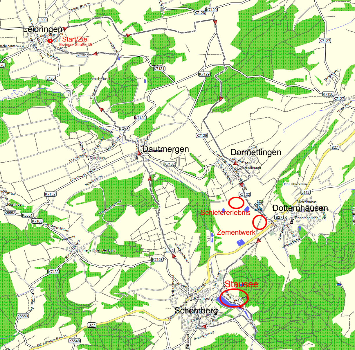 Panorama der Schwäbischen Alb. Dann rechts abbiegen in Richtung Wasserturm (gut sichtbar). Die Hauptstraße queren und dann rechts auf den Radweg abbiegen (am Wasserturm vorbei). Nach ca. 200m links Richtung Waldhof (Radwegschild) abbiegen. Immer dem Radweg entlang in Richtung Dormettingen/Schömberg. Am Ortsausgang Dormettingen liegt rechts die Einfahrt zum Schiefererlebnis (Sie können dort einen Halt machen). Die Strecke geht aber geradeaus nach Dotternhausen (Zementwerk voraus). Im Holcim-Zementwerk ist auch ein Fosilienmuseum. Die B27 überqueren (Richtung Ort) und gleich nach 50m rechts in Richtung Schömberg (Radweg vorhanden). Vor Schömberg an der Palmbühl-Kapelle vorbei, geht es dann hinab zum Stausee. Vor dem Staudamm (über den die Autostraße führt) links abbiegen! Sie fahren direkt am Wasser den Stausee entlang (der See liegt rechts). Beim Gasthof Ölmühle fahren Sie scharf rechts (an der Eisstockbahn vorbei) und gelangen auf dem Radweg ins Schömberger-Industriegebiet. Hier rechts fahren um in die Innenstadt von Schömberg zu gelangen. Dort fahren stehen Sie vor der B27 und fahren links. Dann gleich nach 50m (beim Cafe Baier) fahren Sie rechts und die nächste Abzweigung wieder rechts in Richtung Dautmergen. Dies ist eine normale Autostraße mit wenig Verkehr - (es gibt kein Radweg!). In Dautmergen rechts über die Schlichembrücke und nach der Brücke gleich links in Richtung Leidringen. 400m nach Dautmergen rechts fahren und 200m später links fahren (Richtung Leidringen). Nun nach ca 80m aber sofort wieder nach rechts die Steigung auf dem schmalen Ortsverbindungsweg nehmen (nicht dem Radwegschild folgen - dieses zeigt nach links - warum auch immer?) Der Weg führt an das Leidringer Sportgelände und den Espelsee (ca. 3km). Unten auf der Hauptstraße links abbiegen und dann gleich den Radweg nehmen der rechts entlang der Hauptstraße führt. Der Radweg hört 150m vor Leidringen auf. Entweder Sie fahren noch kurz auf der Hauptstraße oder links über die Siedlung ins Ort rein. |
