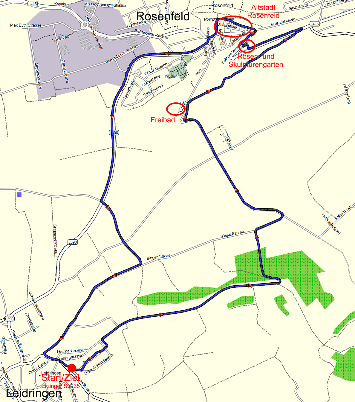 Ortsverbindungsweg. Diesem folgen wir nun längere Zeit. Recht sehen Sie das Panorama der Schwäbischen Alb. Sie kommen an einem Grillplatz vorbei, der links vom Weg liegt. An der Stelle, an dem der Asphalt endet, gehen Sie nach links. An der nächsten Abzweigung nach ca. 100m gehen Sie rechts. Nun geht es den Schotterweg steil nach unten. Sie gelangen auf die Isinger Straße und biegen rechts ab. Nach ca. 200m biegen Sie links ab. Es geht zum Rosenfelder Sportgelände hoch. Immer dem Weg folgend geht es dann hinunter zum Freibad (Sofienbad). Am Freibad dann rechts auf den Schotterweg abbiegen (an den Wohnmobil-Stellplätzen vorbei). Nun immer dem Weg folgen. Sie kommen durch eine Schrebergartensiedlung. Der Weg endet an der Hauptstraße Rosenfeld-Balingen. Sie überqueren die Straße und gehen links den Gehweg hoch. Nach ca. 300m sind Sie am Rosen- und Skulpturengarten. Der Einritt ist frei. Bestaunen Sie die Anlage, die Pflanzungen und die Skulpturen. Um in die Altstadt zum kommen, nehmen Sie die Treppe, die vom Garten hoch zur Hauptstraße führt. Dort nehmen Sie den Gehweg an der Straße entlang hoch in die Stadt. Am Brunnen vor der Kirche, biegen Sie rechts ab in die Mömpelgardstraße. Hier beginnt die Altstadt. Bestaunen Sie die alten Fachwerkhäuser. Es gibt auch Stadtführungen (mehr dazu auf www.rosenfeld.de). Wenn Sie die Altstadt hinter sich haben, biegen Sie oben an der Volksbank nach links in Richtung Leidringen (Leidringer Straße) und bleiben auf dem Gehweg bis ans Ortsende. Der Weg führt weiterhin geradeaus auf dem asphaltierten Feld- und Radweg, der entlang der Autostraße nach Leidringen führt. Mitten zwischen Rosenfeld und Leidringen biegen Sie nach links ab und überqueren die Autostraße. Dieser asphaltierte Weg führt über eine weitere Feldkreuzung auf die Isinger Straße (links nach Isingen, geradeaus den Berg hoch, rechts nach Leidringen). Wir nehmen den Weg nach rechts und gelangen nach ca. einem Kilometer ins Ort. Wir stossen auf die Erzinger Straße und biegen links ab. Nach 2 Minuten sind Sie wieder am Gästehaus. Diese Strecke ist auch gut mit jedem Fahrrad (ausser Rennrad) zu fahren. Den Rosengarten umfahren Sie oder Sie tragen das Rad durch den Rosengarten die Treppen hoch. |